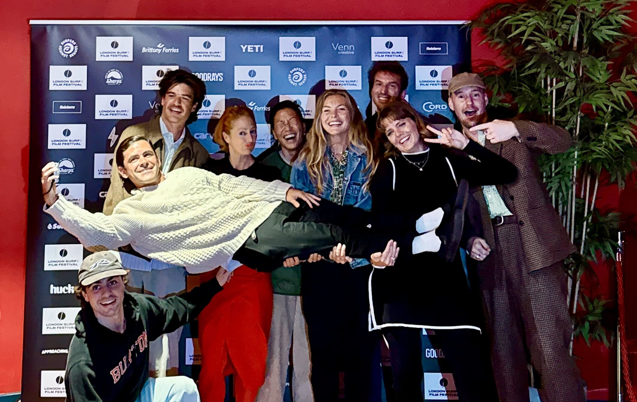London Surf Film Festival 2025: You know we’re al about celebrating and elevating the creativity that exists i surfing, so are our filmmakers! L to R: Olly McLellan, Quinn Graham, Dorthe Eickelberg, Karen Song, Maddie Meddings, Joaquin Azulay, Lucy Small, Jonathan Stromberg uplifting Rodrigo Valsamis
